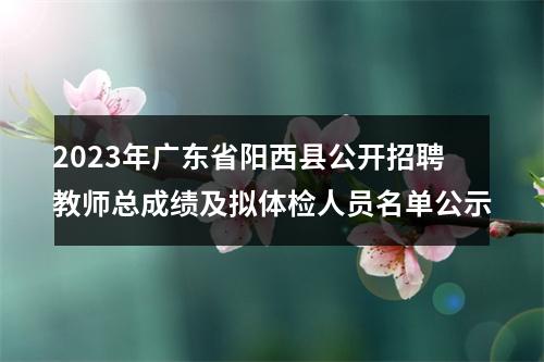 | 教师招聘 | 1:广东省阳西县2023年公开招聘教师总成绩及拟体检人员名单.xlsx 阳西县教育局 阳西县人力资源和社会保障局 2023年4月4日 原标题:广东省阳西县2023年公开招聘教师总成绩及拟体检人员名单公示 文章来源:http://www.yangxi.gov.cn/gk/tzgg/content/post_696935.html